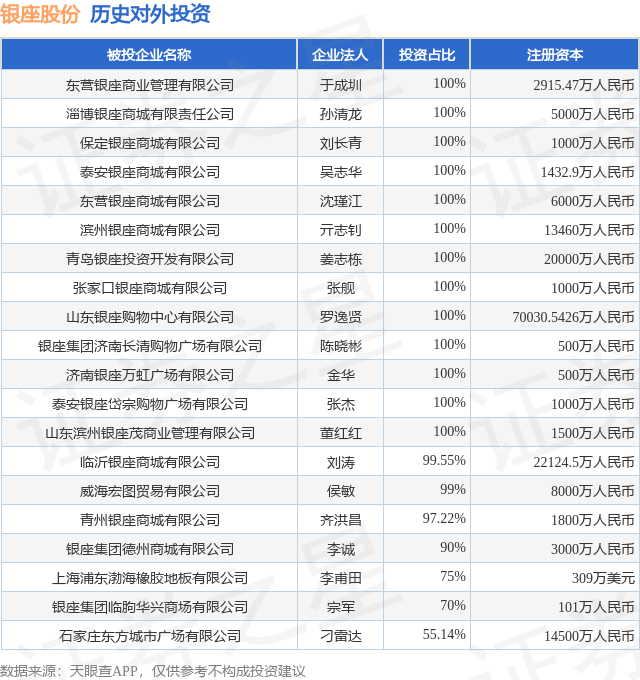 本站音书开yun体育网,把柄天眼查APP泄漏,银座股份(600858.SH)新增总共对外投资事件,被投资公司为东营银座交易处置有限公司,法定代表东谈主于成圳,投资占比为100%。该公司从事房地产业,注册成本为2915.47万东谈主民币。现在,银座股份共存在对外投资24项,投资占比前20的边幅见下表: